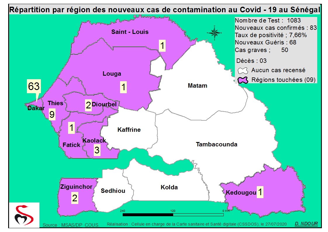 Coronavirus : Répartition par Région et District des cas de contamination à la Covid-19 au Sénégal du 27 juillet 2020