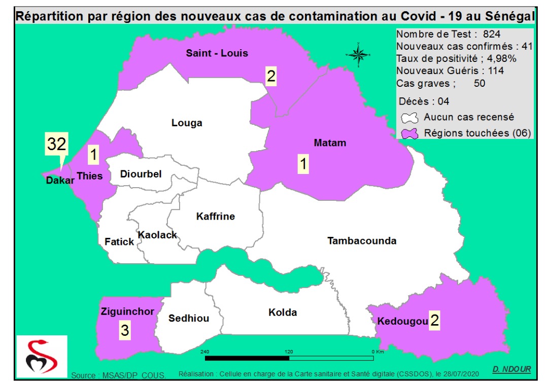 Coronavirus : Répartition par Région et District des cas de contamination à la Covid-19 au Sénégal du 28 juillet 2020