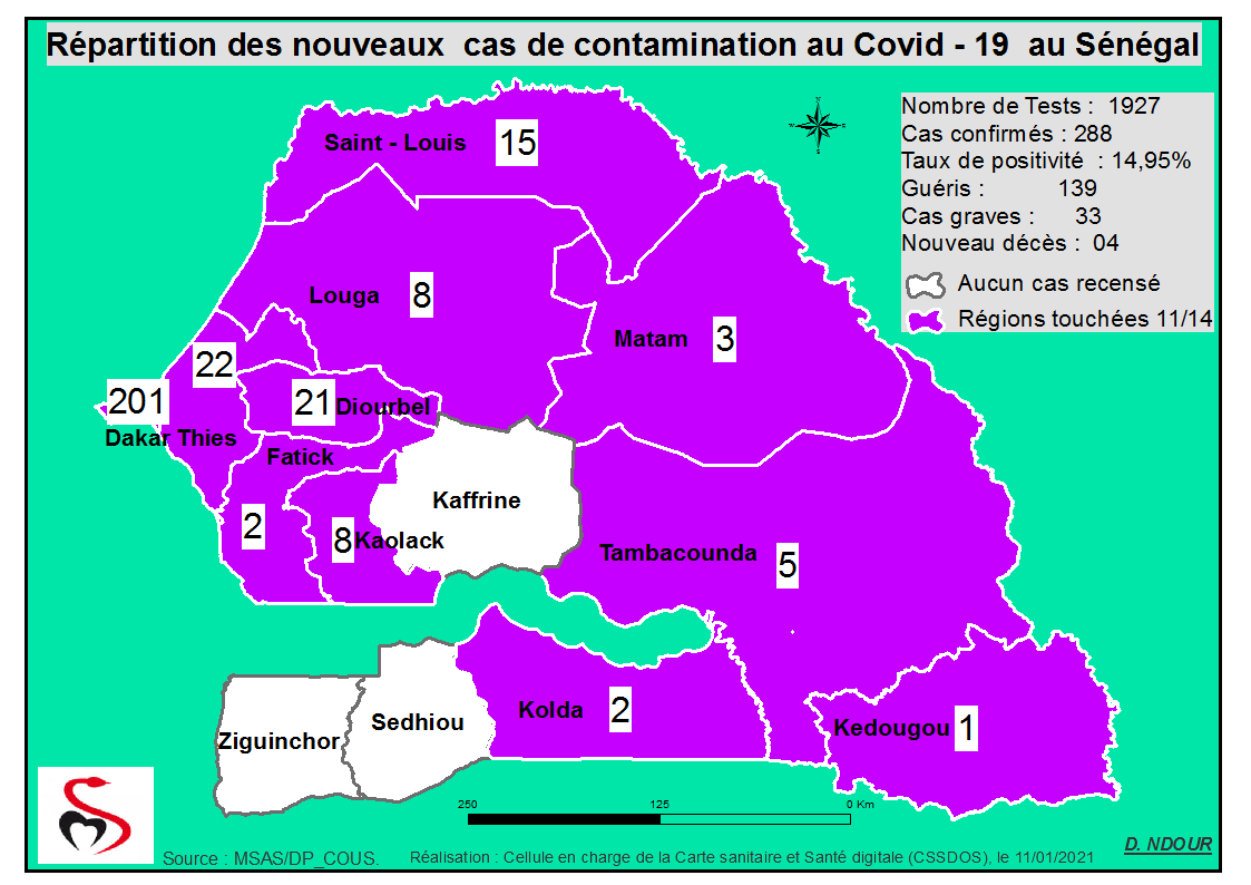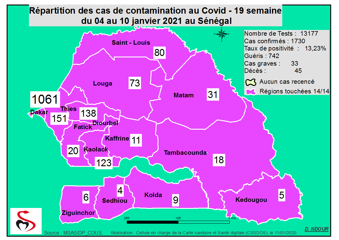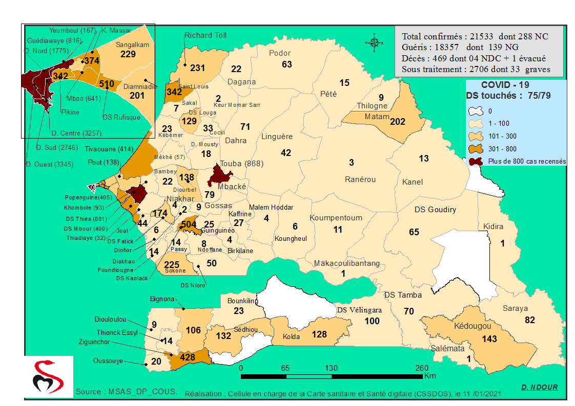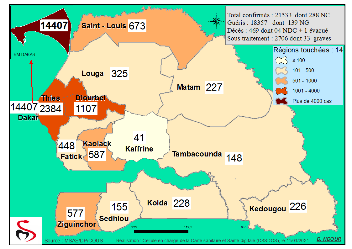 Coronavirus : Répartition par Région et District des cas de contamination à la Covid-19 au Sénégal du Lundi 11 Janvier 2021