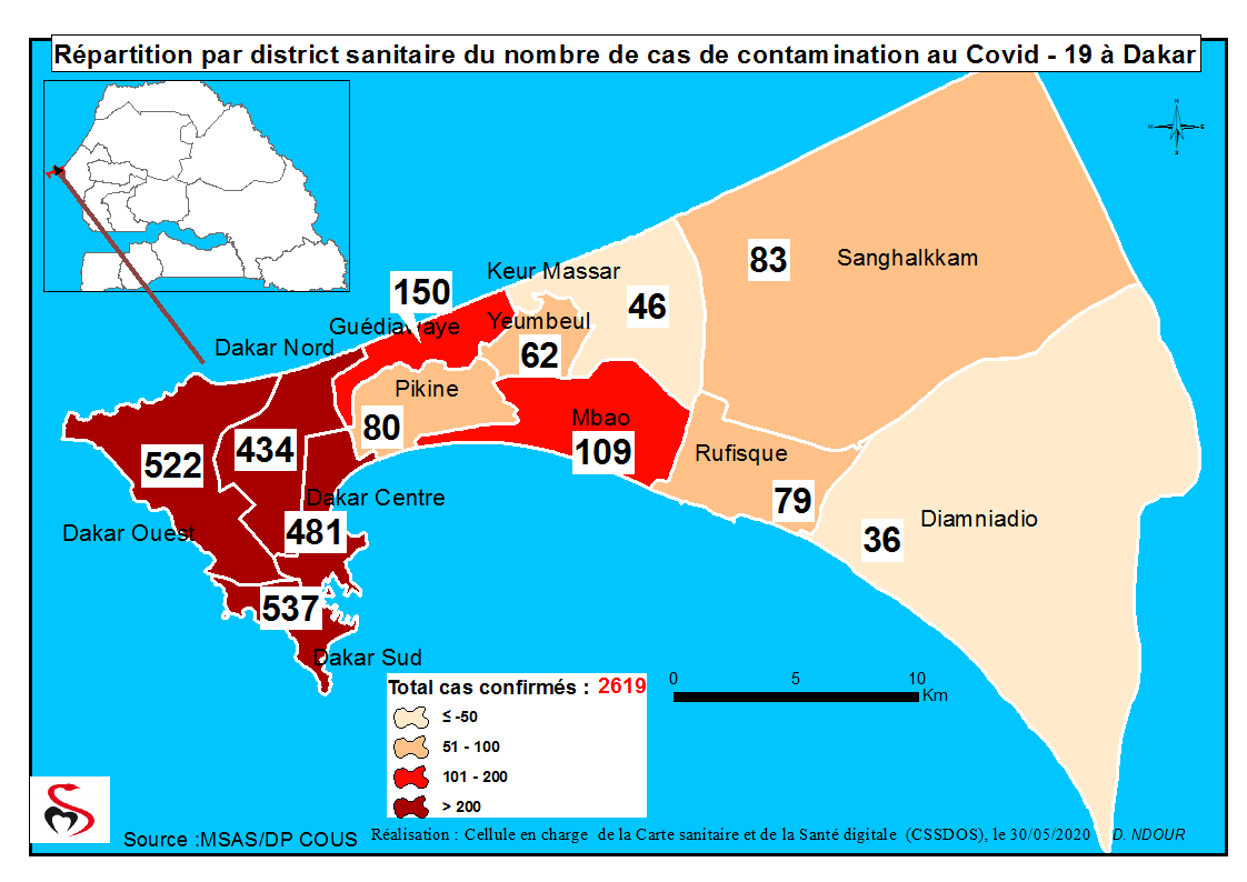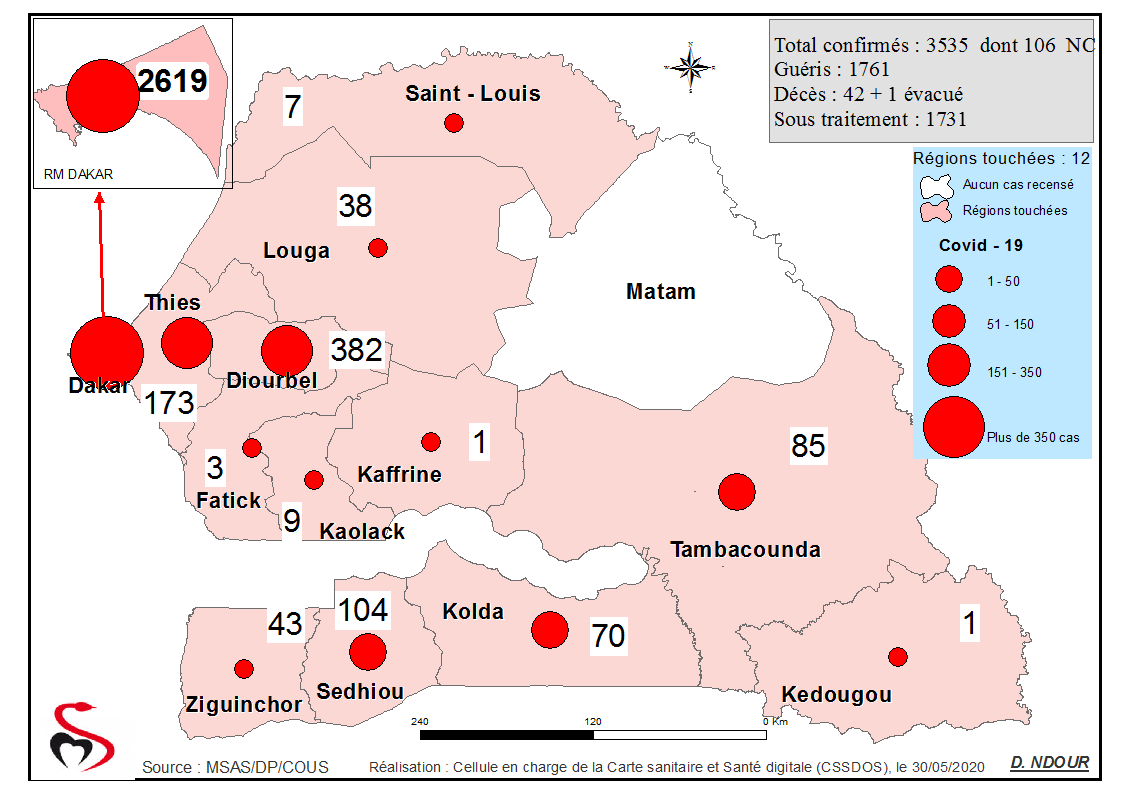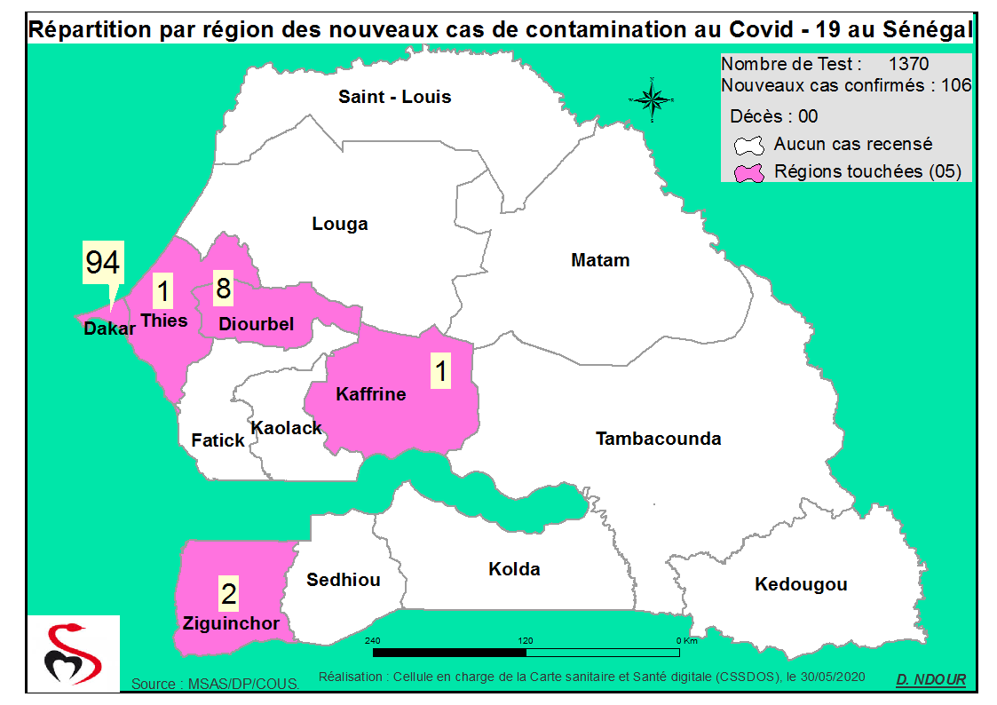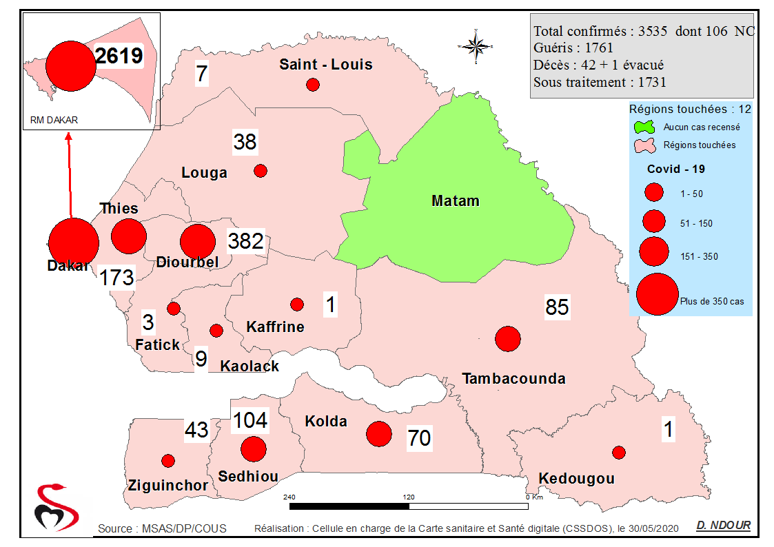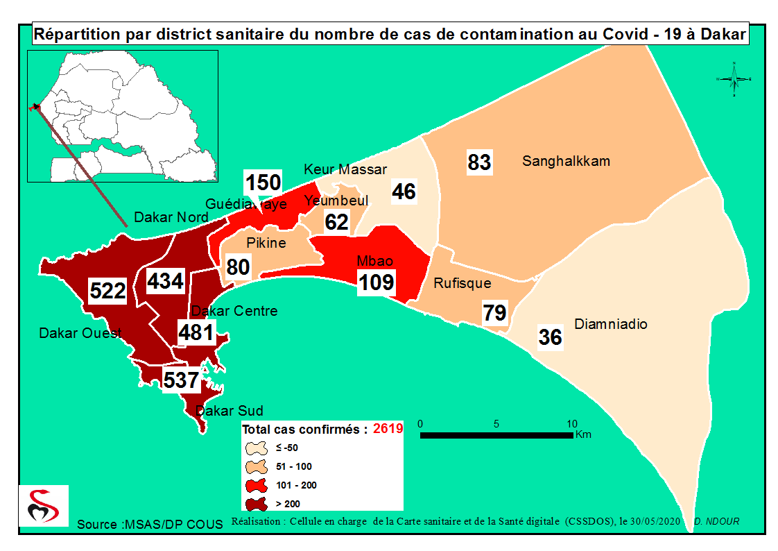 Accueil / Mediathèque / Phototheques / Coronavirus : Répartition par Région et District des cas de contamination au Covid-19 au Sénégal du 30 Mai 2020