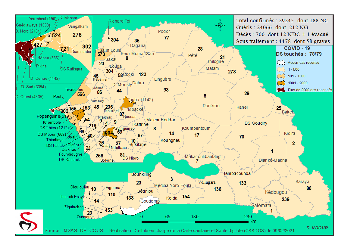 Coronavirus : Répartition par Région et District des cas de contamination à la Covid-19 au Sénégal du Mardi 09 février 2021