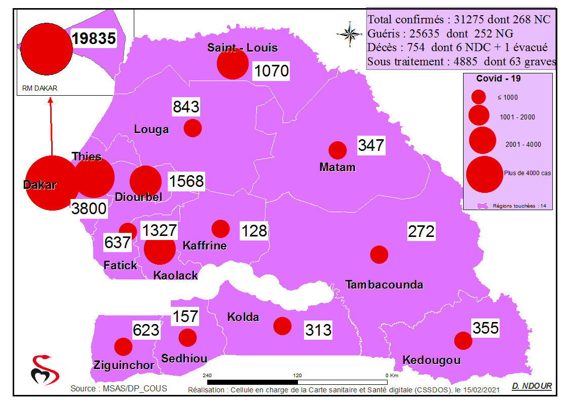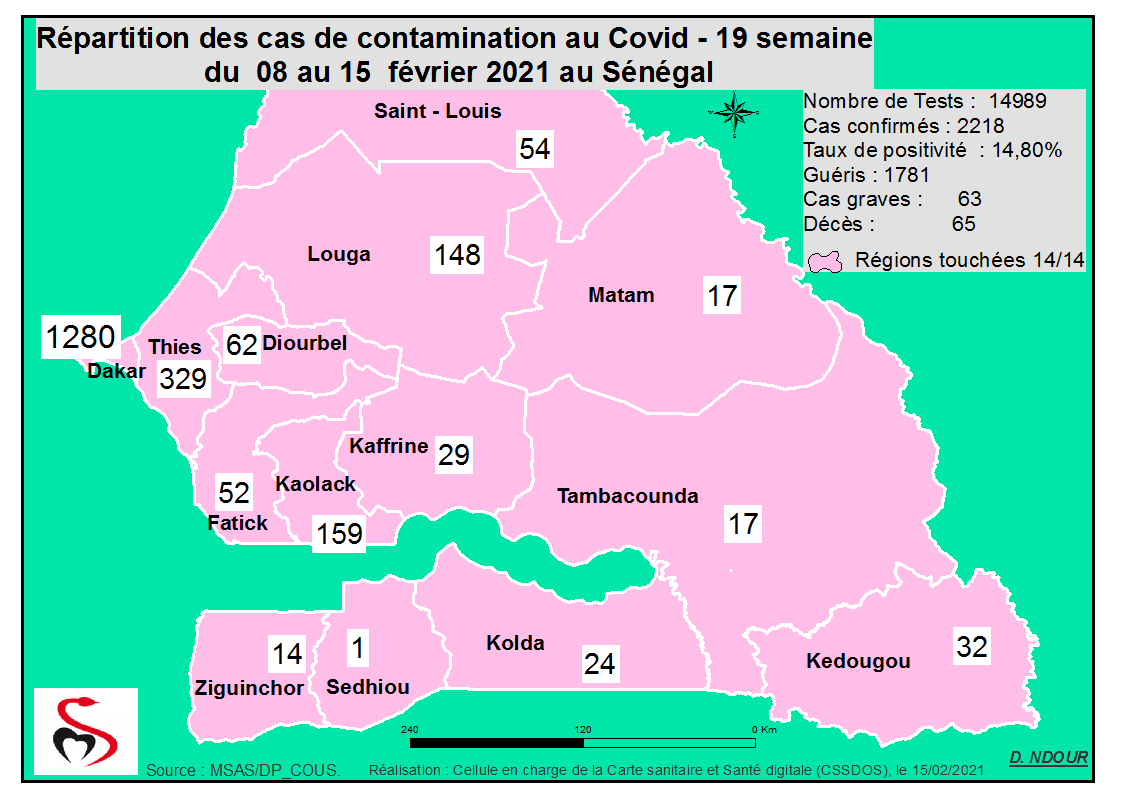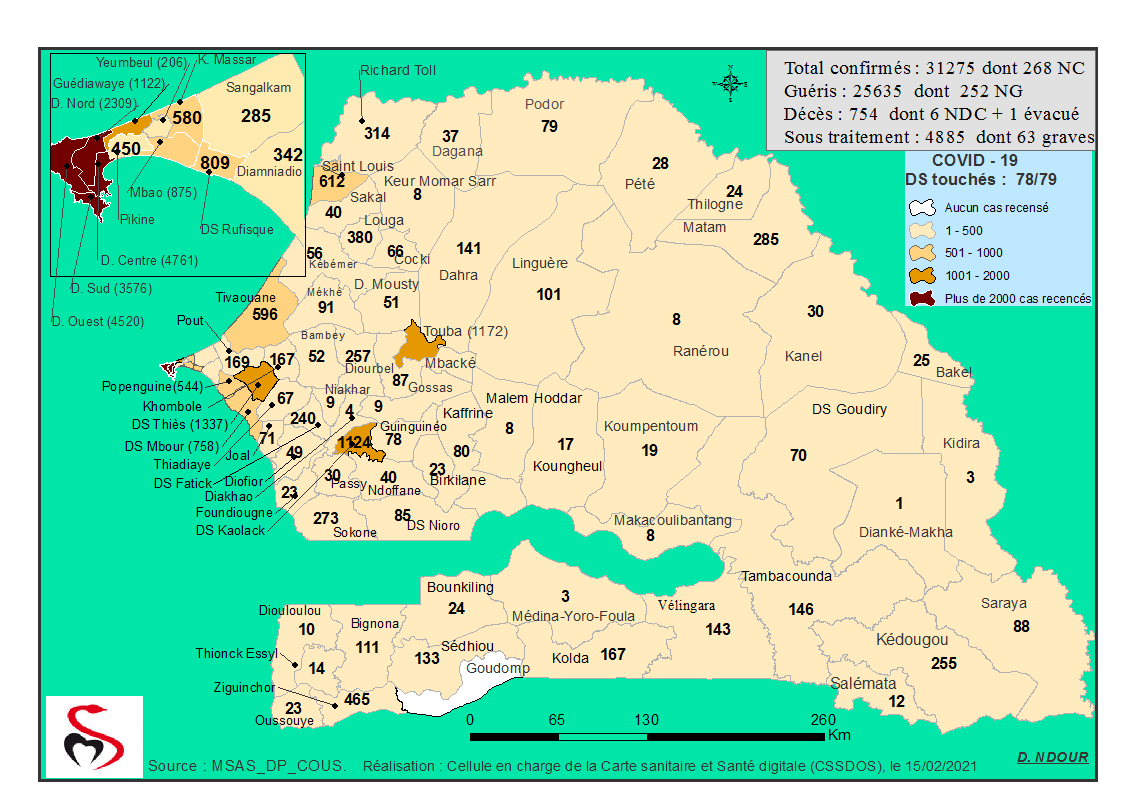 Coronavirus : Répartition par Région et District des cas de contamination à la Covid-19 au Sénégal du Lundi 15 février 2021