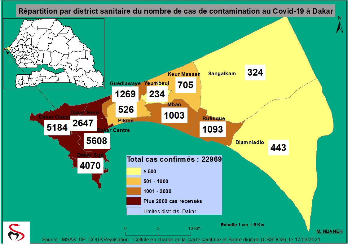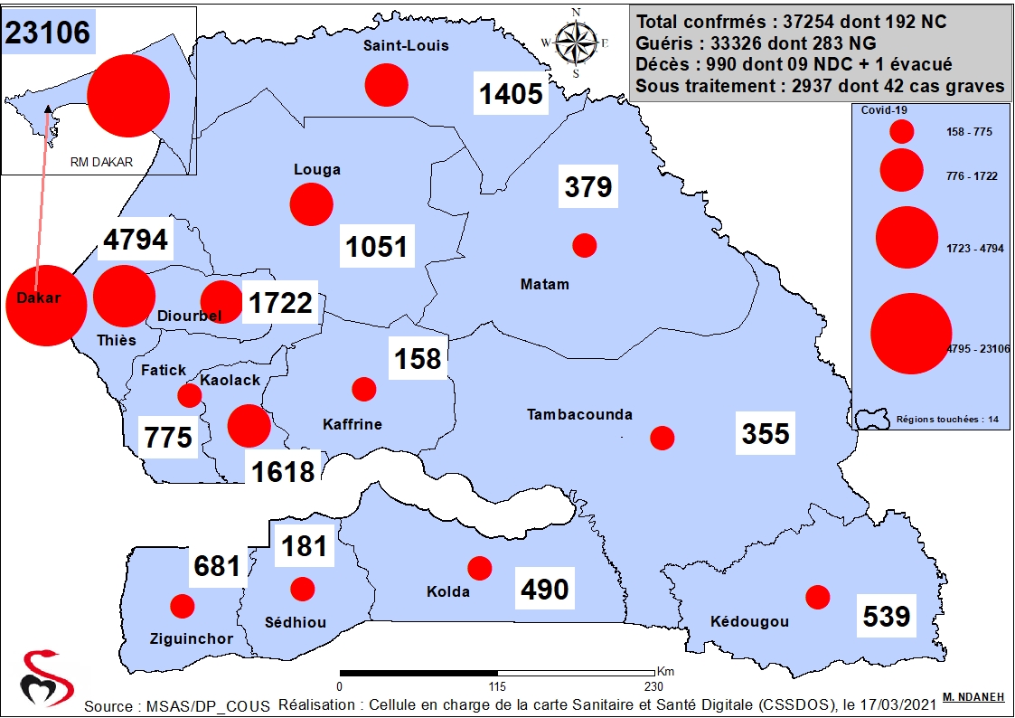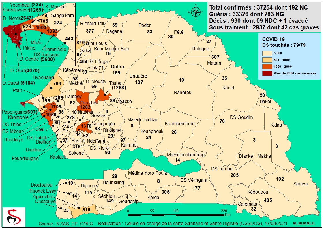 Coronavirus : Répartition par Région et District des cas de contamination à la Covid-19 au Sénégal du Mercredi 17 mars 2021
