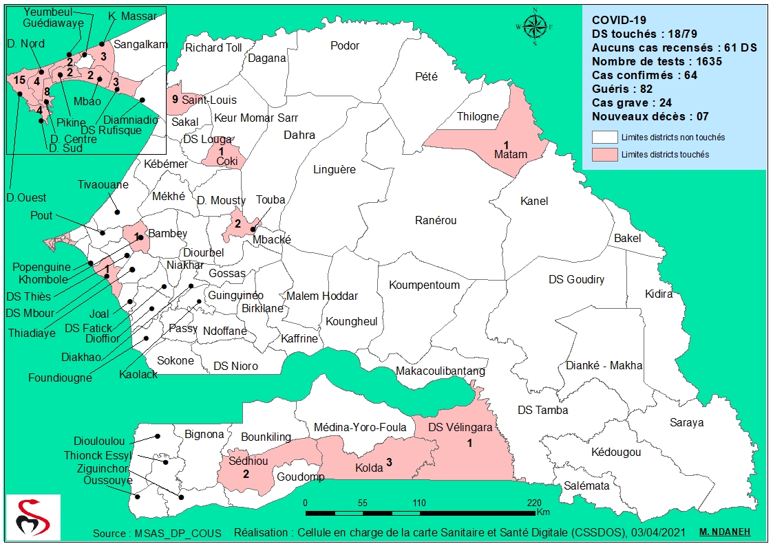 Coronavirus : Répartition par Région et District des cas de contamination à la Covid-19 au Sénégal du Samedi 03 Avril 2021