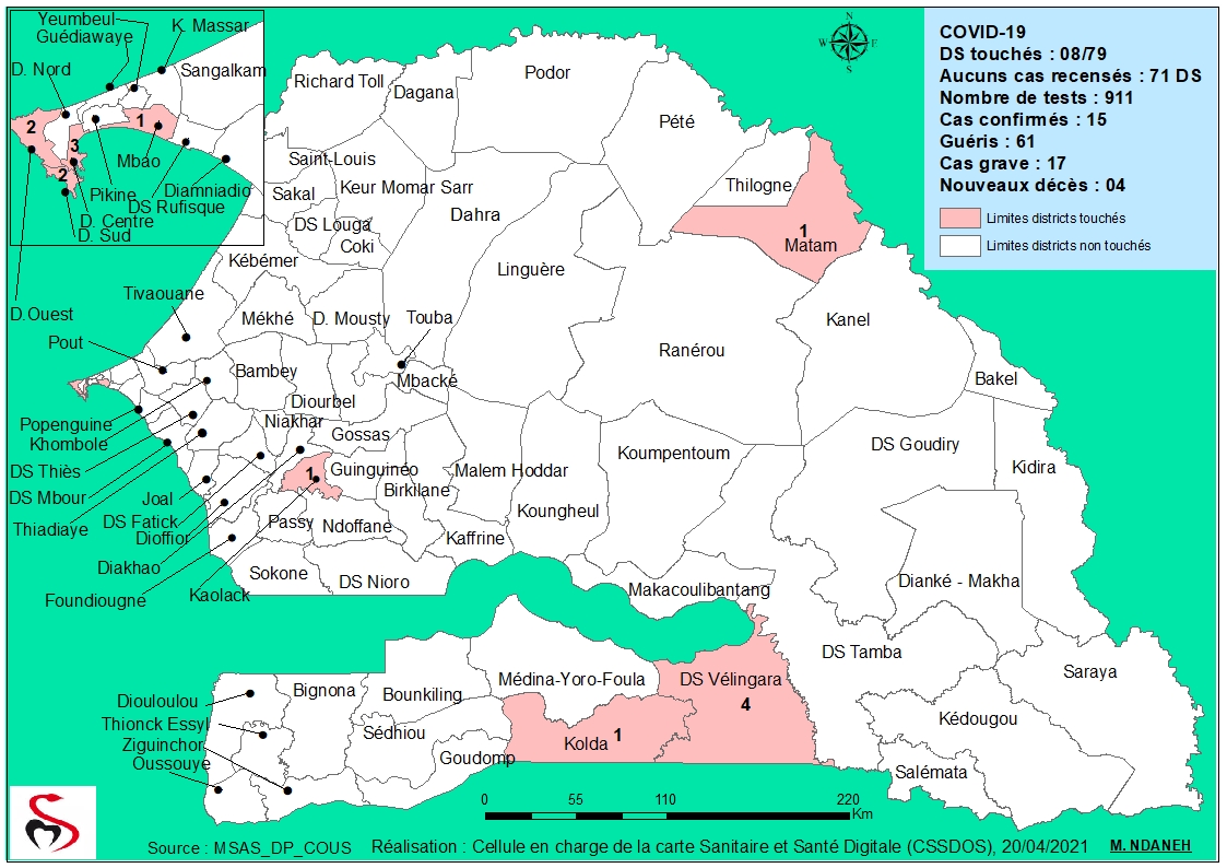 Coronavirus : Répartition par Région et District des cas de contamination à la Covid-19 au Sénégal du Mardi 20 Avril 2021