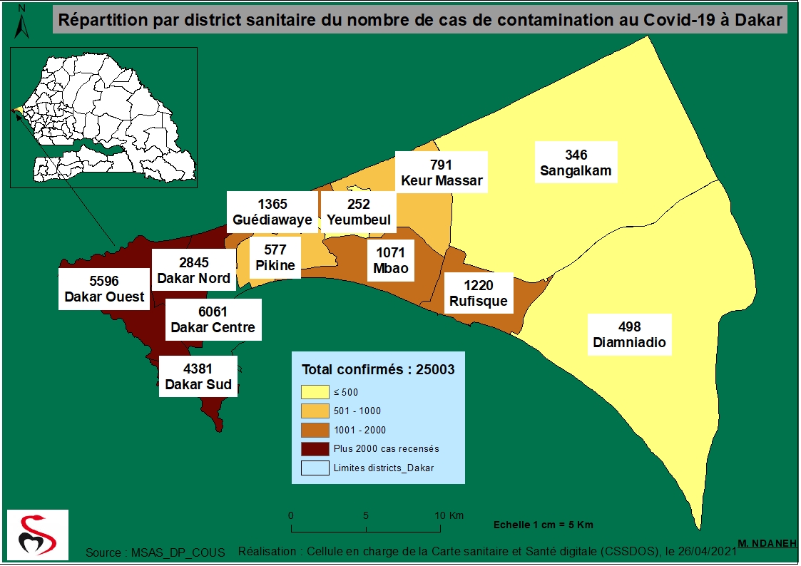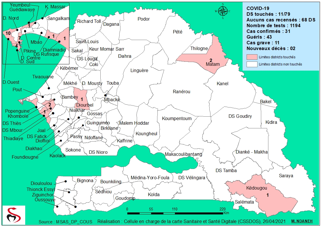 Coronavirus : Répartition par Région et District des cas de contamination à la Covid-19 au Sénégal du Lundi 26 Avril 2021