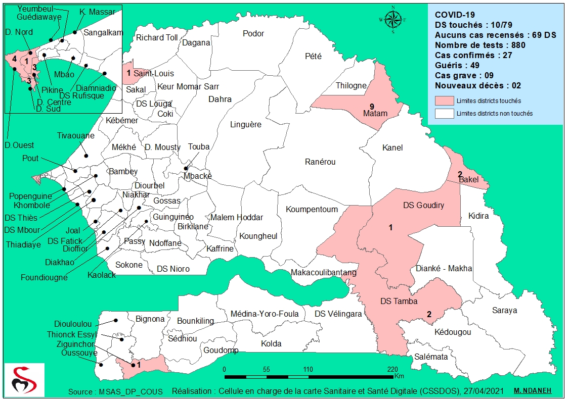 Coronavirus : Répartition par Région et District des cas de contamination à la Covid-19 au Sénégal du Mardi 27 Avril 2021