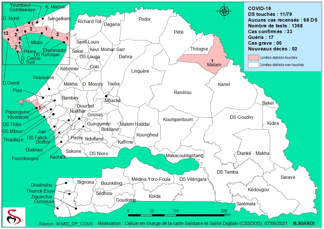 Coronavirus: Répartition par Région et District des cas de contamination à la Covid-19 au Sénégal du Lundi 07 Juin 2021