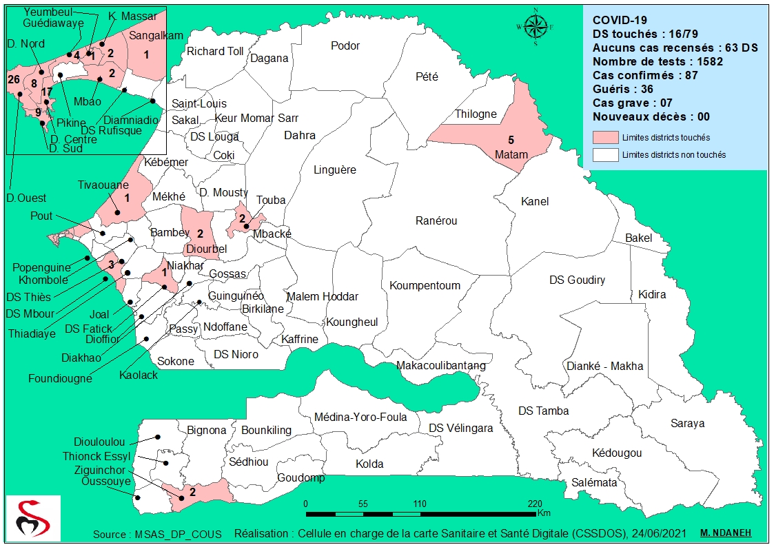 Coronavirus: Répartition par Région et District des cas de contamination à la Covid-19 au Sénégal du Jeudi 24 Juin 2021