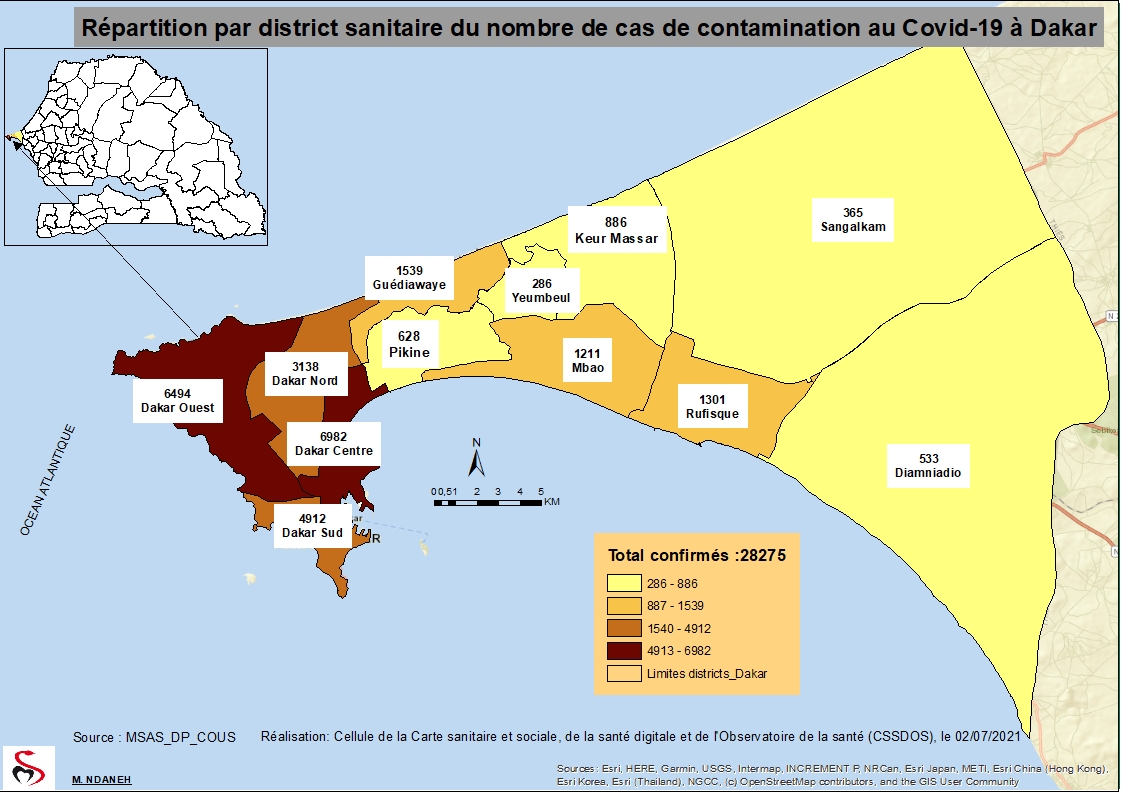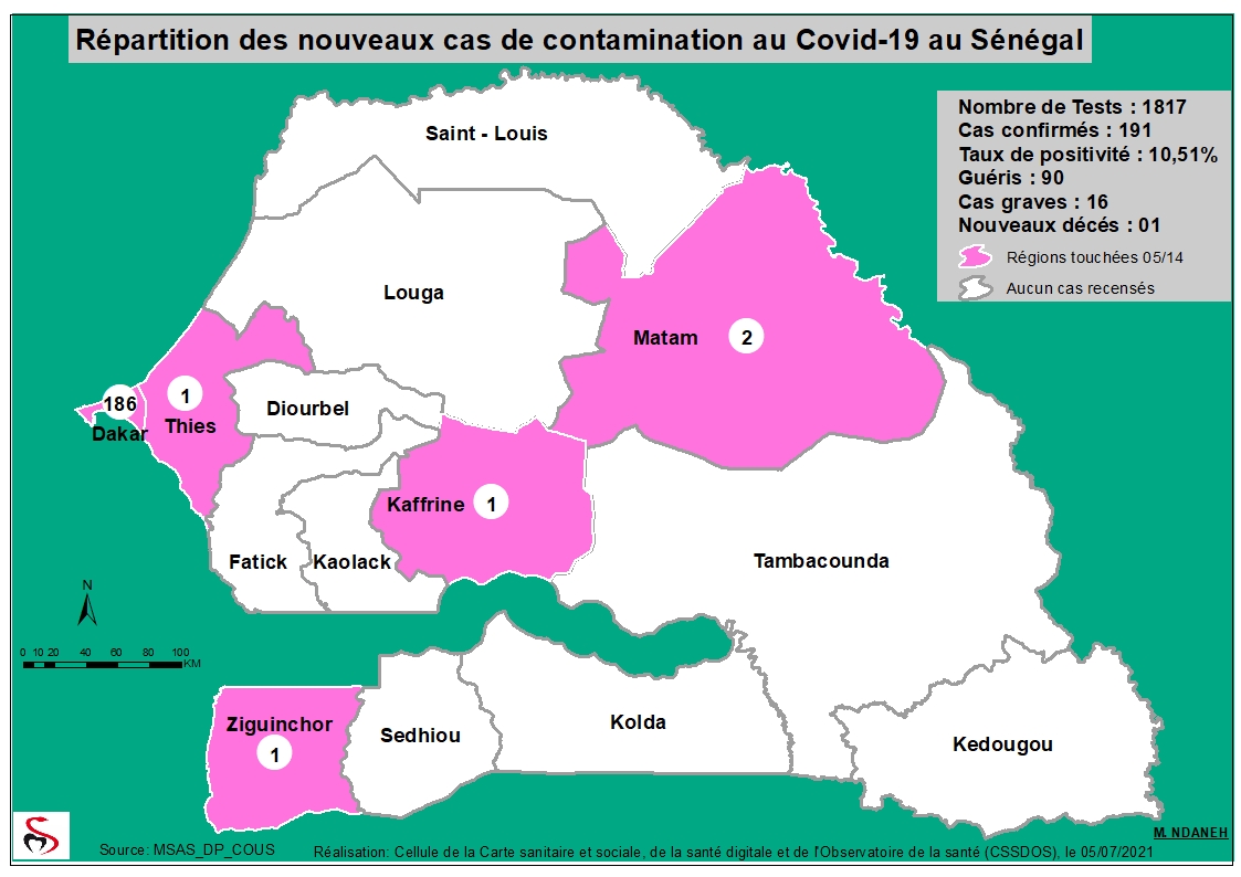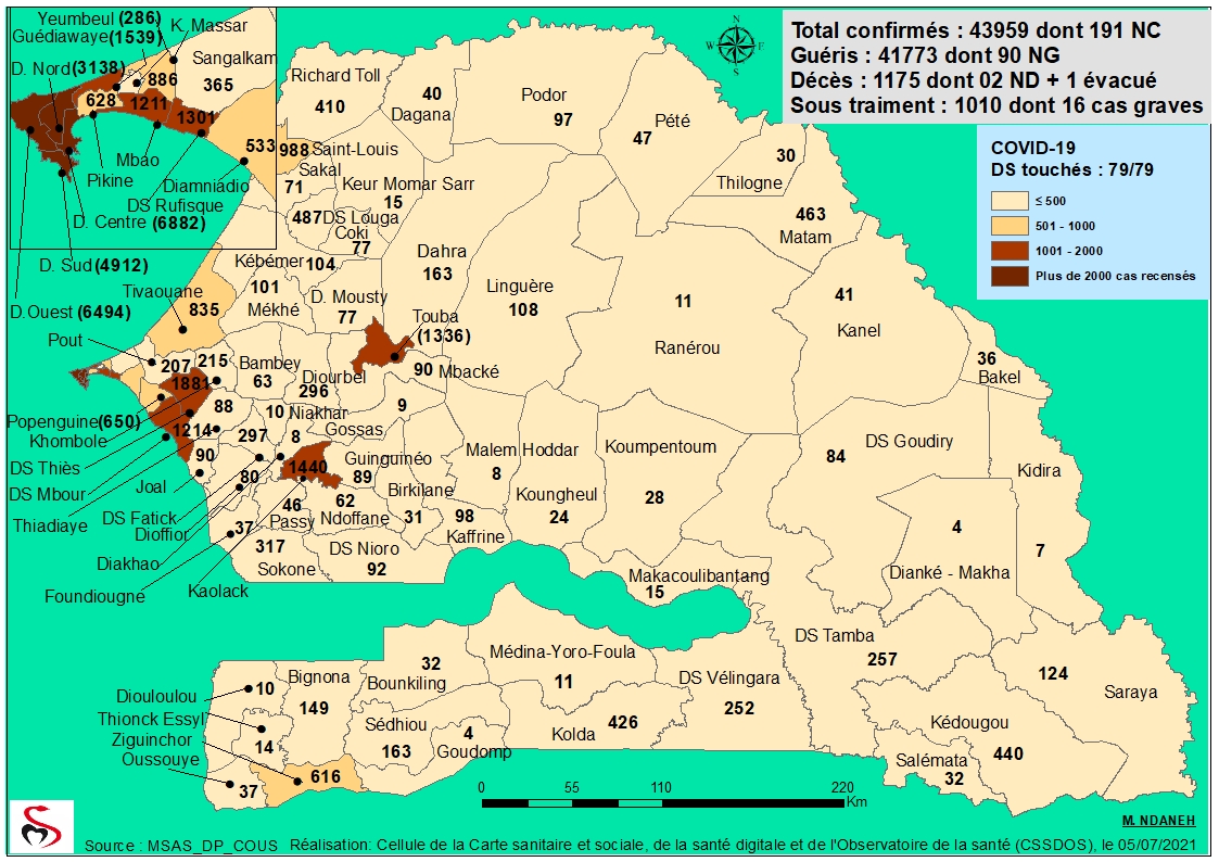 Accueil / Mediathèque / Phototheques / Coronavirus: Répartition par Région et District des cas de contamination à la Covid-19 au Sénégal du Lundi 05 Juillet 2021