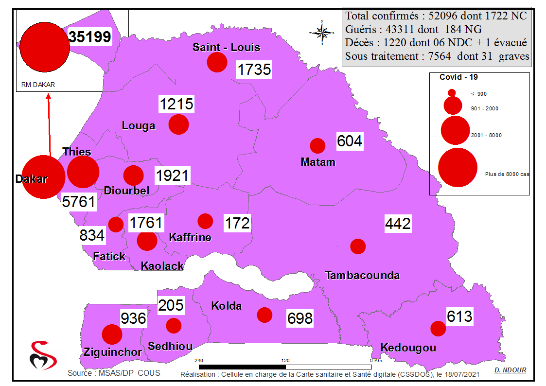 Coronavirus: Répartition par Région et District des cas de contamination à la Covid-19 au Sénégal du Dimanche 18 Juillet 2021