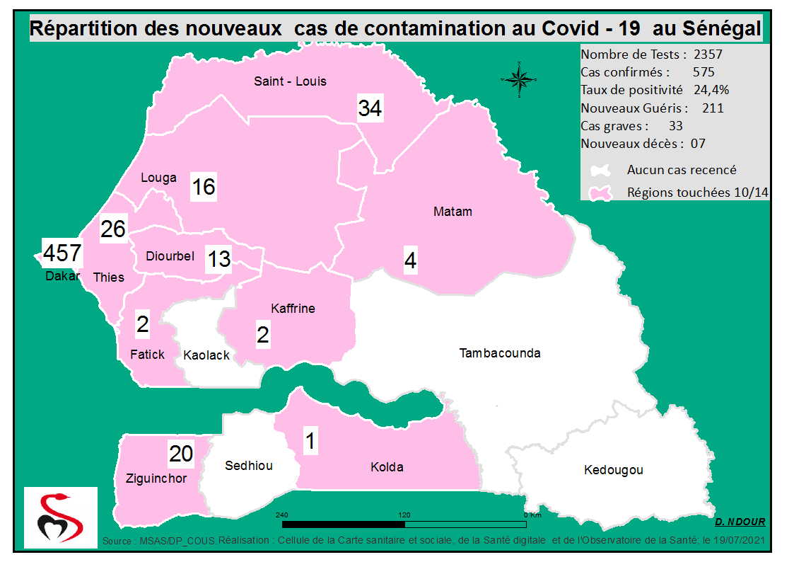 Coronavirus: Répartition par Région et District des cas de contamination à la Covid-19 au Sénégal du Lundi 19 Juillet 2021