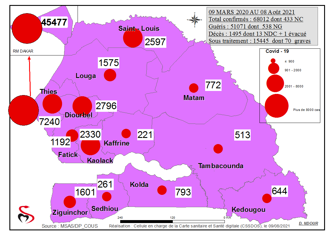 Coronavirus: Répartition par Région et District des cas de contamination à la Covid-19 au Sénégal du Lundi 09 Août 2021