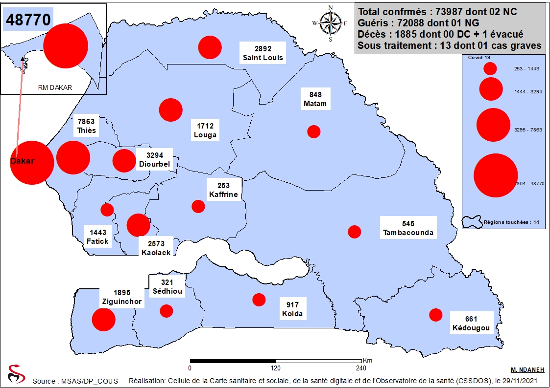 Coronavirus: Répartition par Région et District des cas de contamination à la Covid-19 au Sénégal du Lundi 29 Novembre 2021
