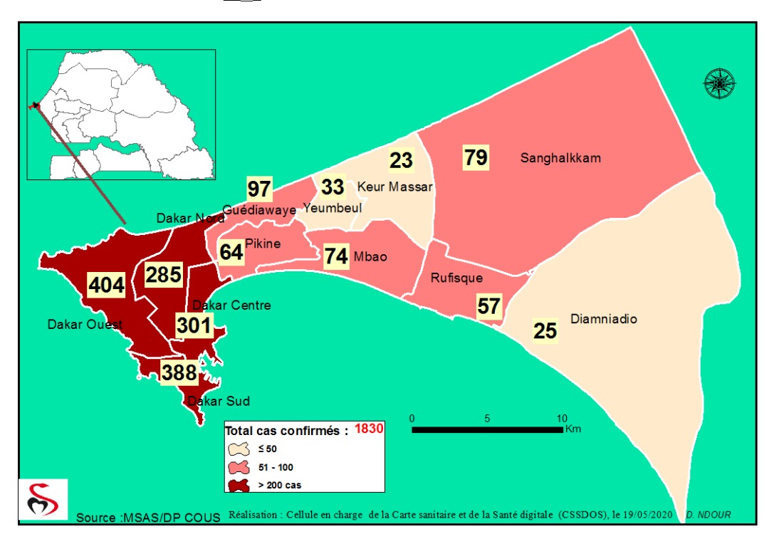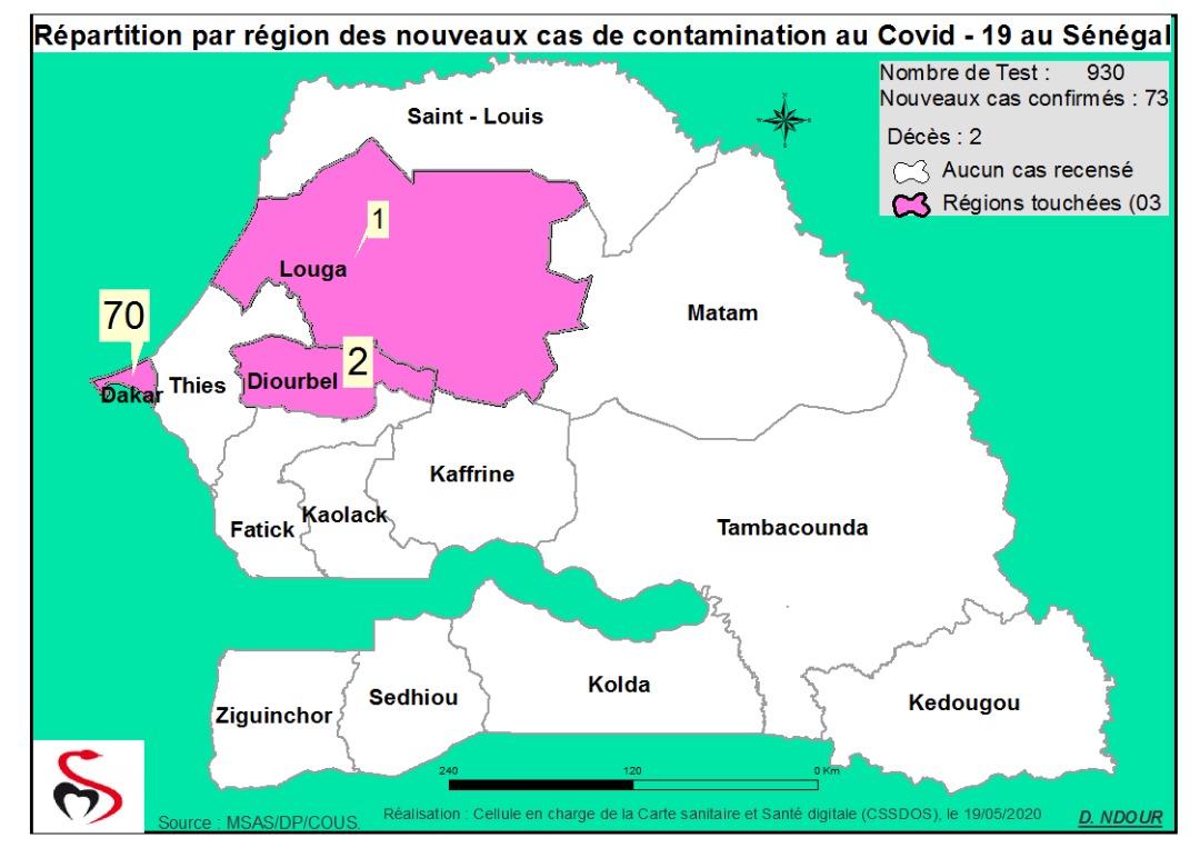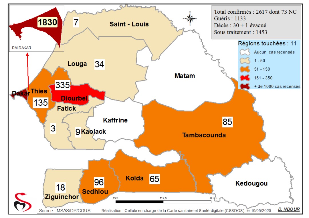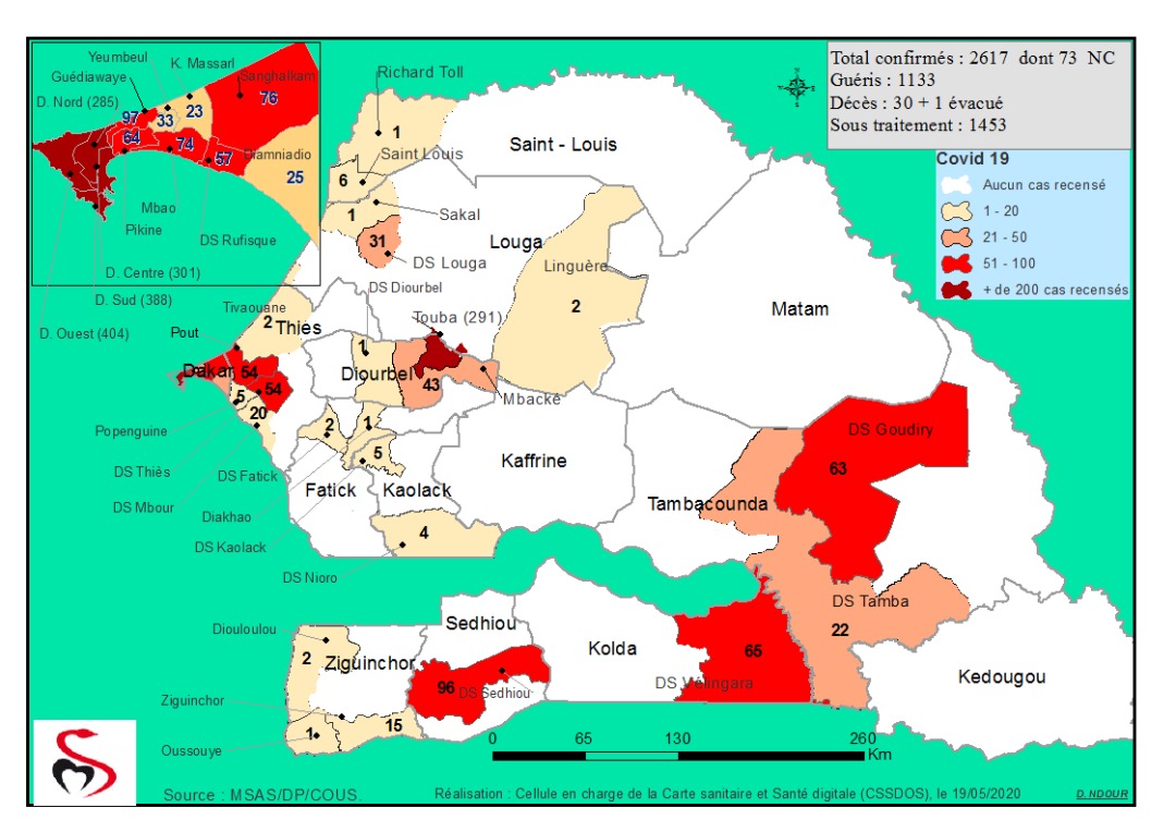 Accueil / Mediathèque / Phototheques / Coronavirus : Répartition par Région et District des cas de contamination au Covid-19 au Sénégal du 19 Mai 2020