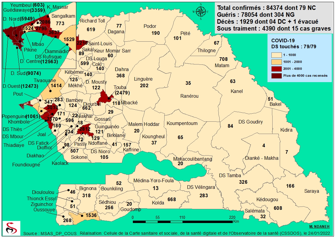 Coronavirus: Répartition par Région et District des cas de contamination à la Covid-19 au Sénégal du Lundi 24 janvier 2022