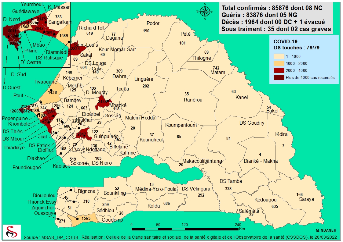 Coronavirus: Répartition par Région et District des cas de contamination à la Covid-19 au Sénégal du Lundi 28 Mars 2022
