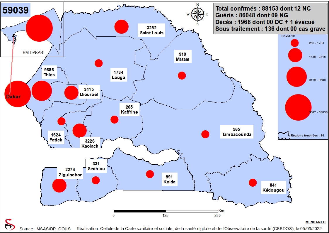 Coronavirus: Répartition par Région et District des cas de contamination à la Covid-19 au Sénégal du Lundi 05 Septembre 2022