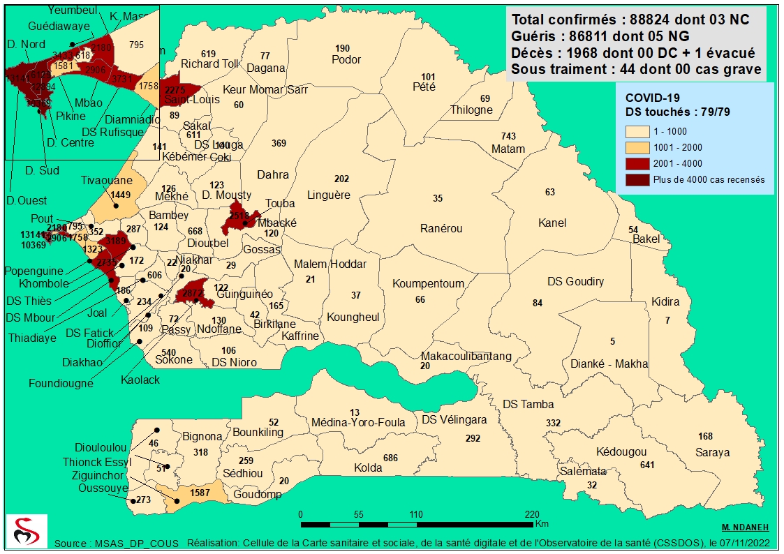 Coronavirus: Répartition par Région et District des cas de contamination à la Covid-19 au Sénégal du Lundi 07 novembre 2022