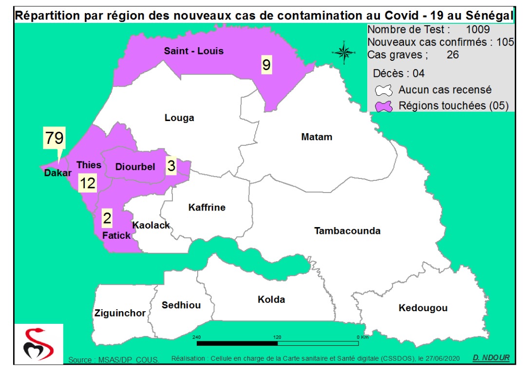 Accueil / Mediathèque / Phototheques / Coronavirus : Répartition par Région et District des cas de contamination au Covid-19 au Sénégal du 27 Juin 2020