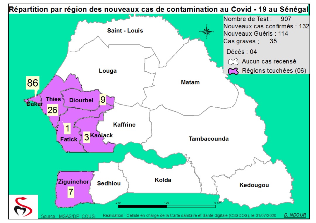 Coronavirus : Répartition par Région et District des cas de contamination au Covid-19 au Sénégal du 01 juillet 2020