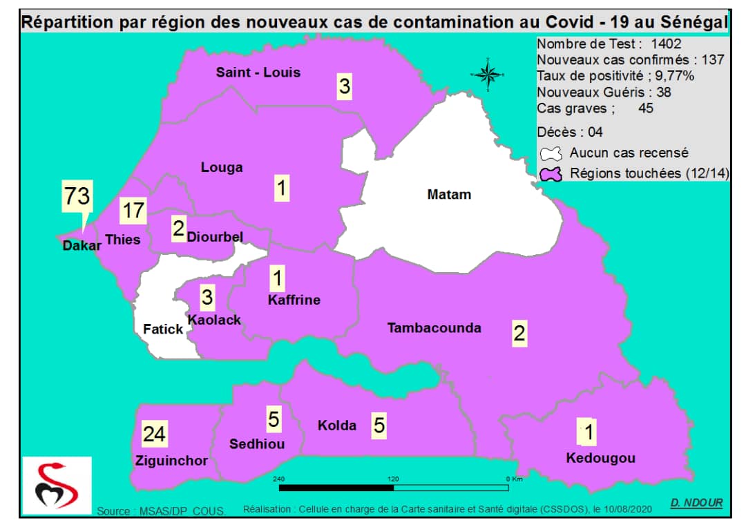 Coronavirus : Répartition par Région et District des cas de contamination à la Covid-19 au Sénégal du 10 Août 2020