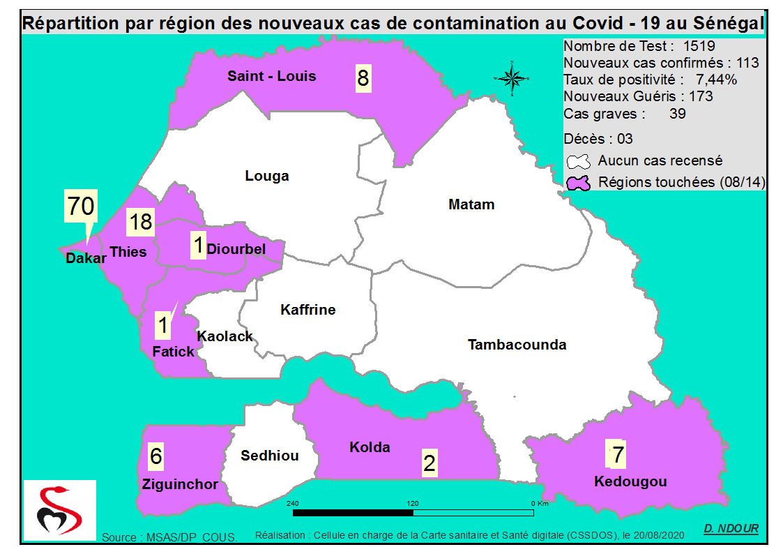 Accueil / Mediathèque / Phototheques / Coronavirus : Répartition par Région et District des cas de contamination à la Covid-19 au Sénégal du 20 Août 2020