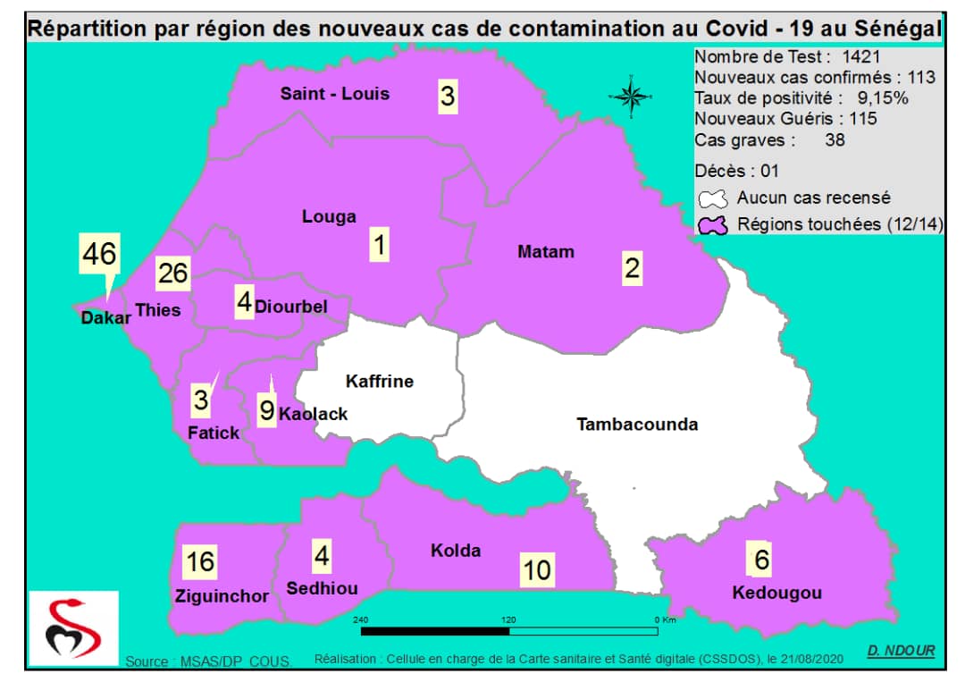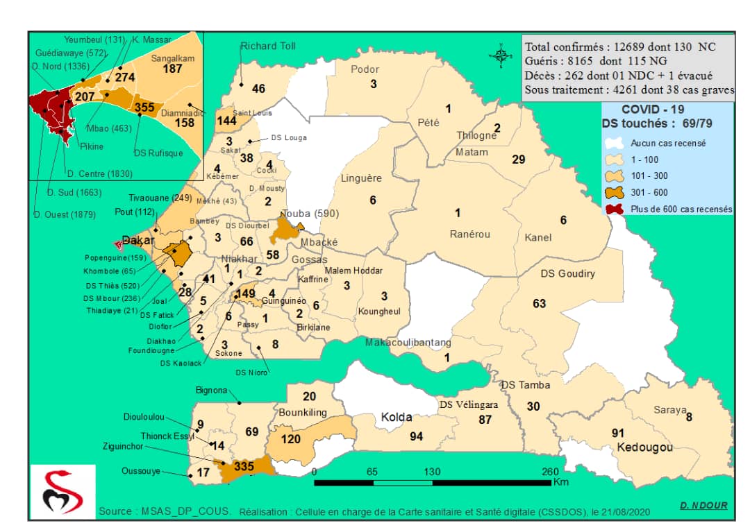 Coronavirus : Répartition par Région et District des cas de contamination à la Covid-19 au Sénégal du 21 Août 2020