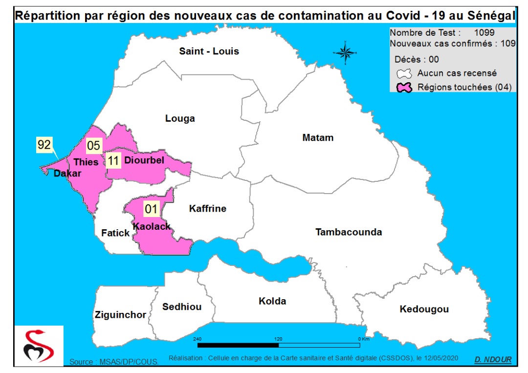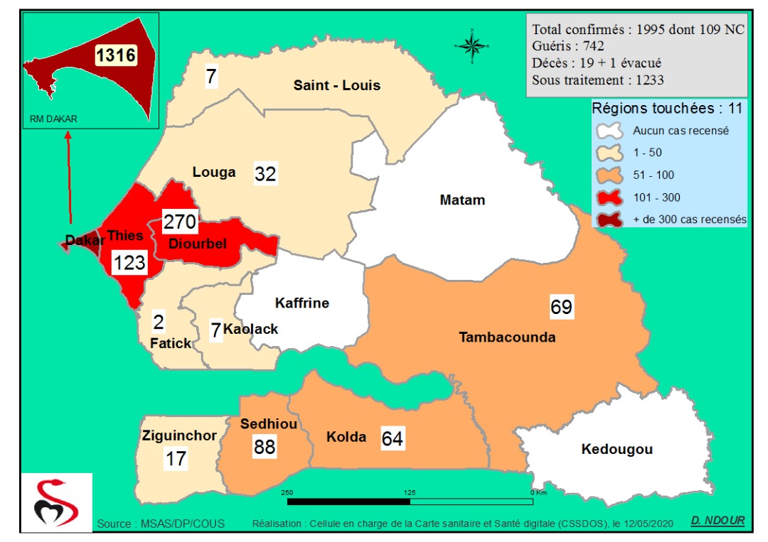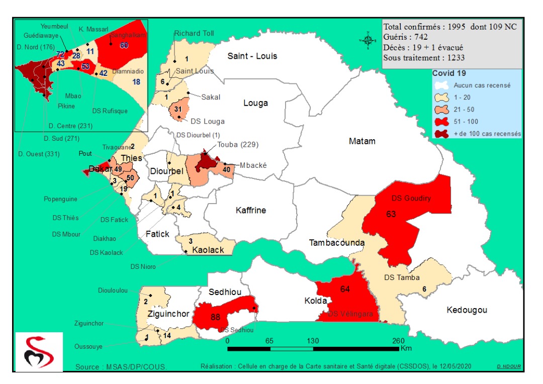 Coronavirus : Répartition par Région et District des nouveaux cas de contamination au Covid-19 au Sénégal du 12 Mai 2020