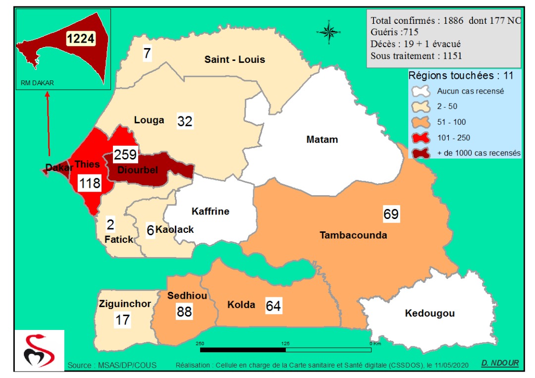 Coronavirus : Répartition par Région et District des nouveux cas de contamination au Covid-19 au Sénégal du 11 Mai 2020