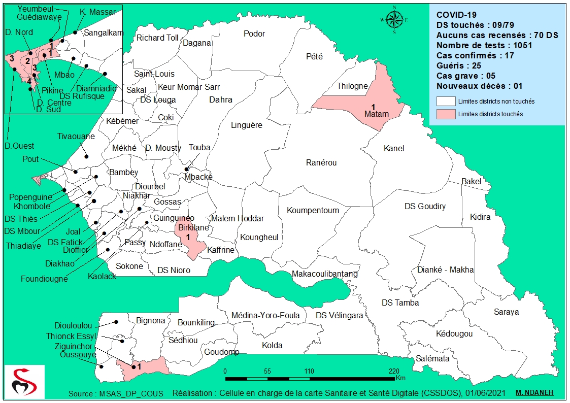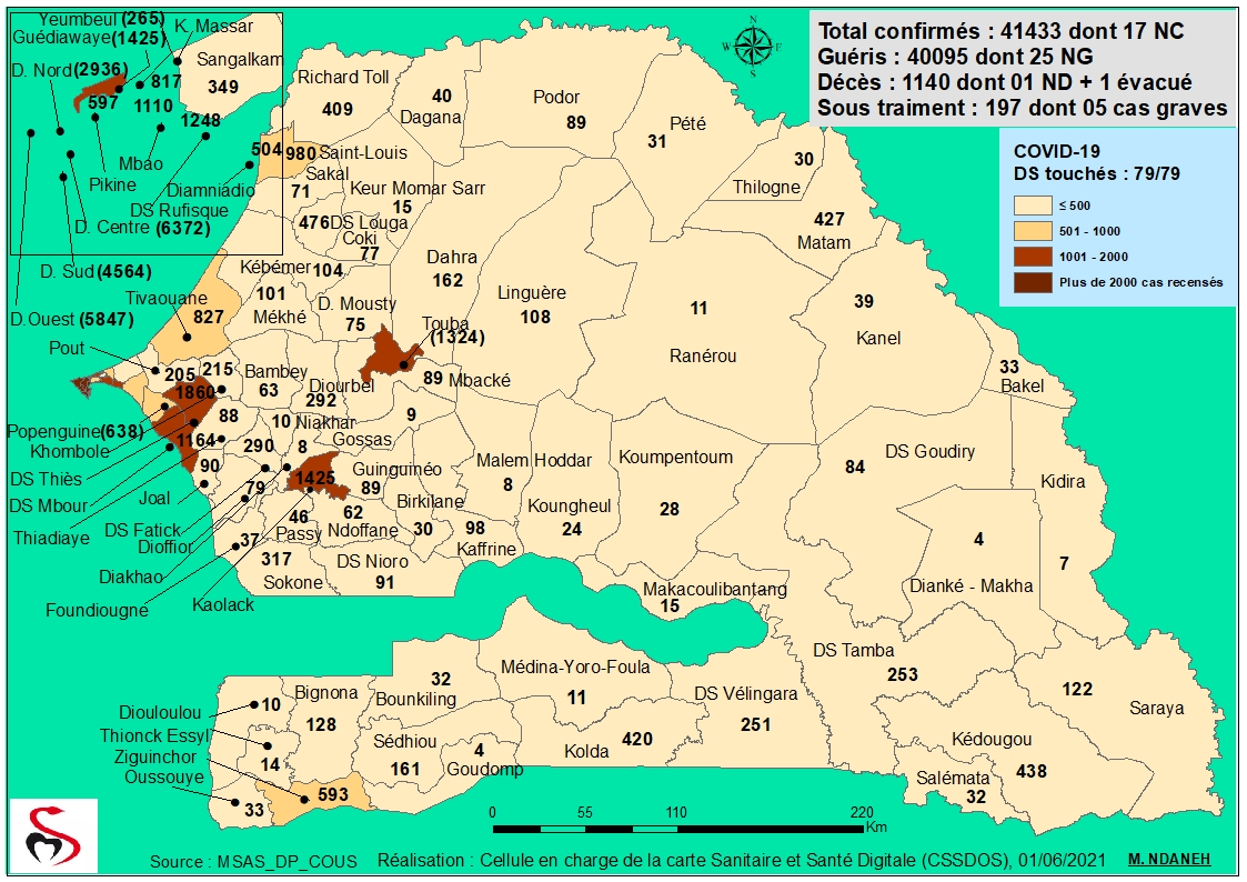 Coronavirus : Repartition par Région et District des cas de contamination à la Covid-19 au Sénégal du Mardi 01 Juin 2021